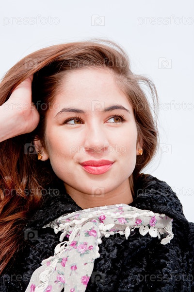 Красивая молодая женщина в шубе на белом фоне