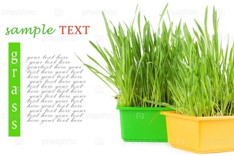Зеленая трава в горшках на белом фоне