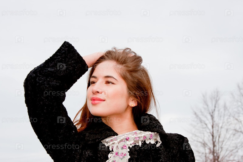 Красивая молодая женщина в шубе на фоне природы