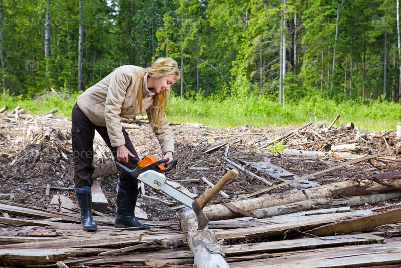 Молодая женщина в лесу пилит дерево цепной пилой