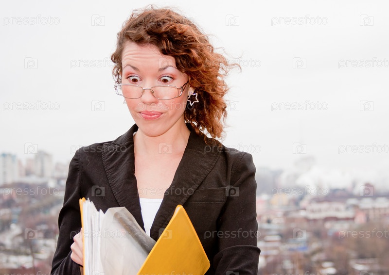 Женщина-предприниматель с документами в руках на фоне города