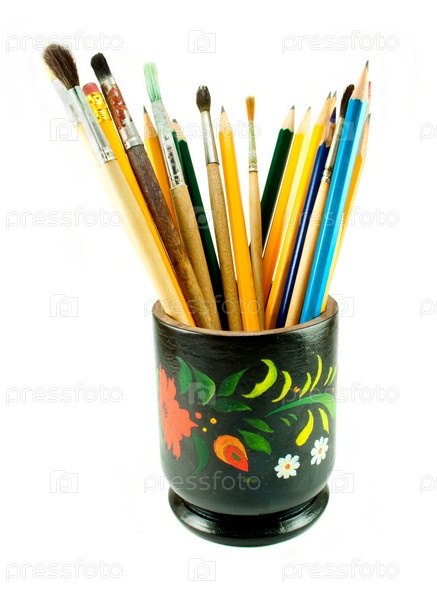 Чашка, наполненная карандашом и кистой