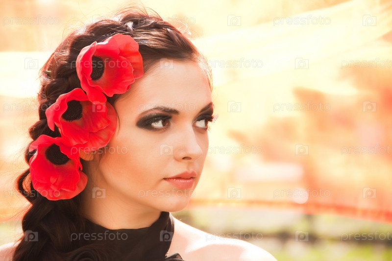 Брюнетка с цветами в волосах крупным планом