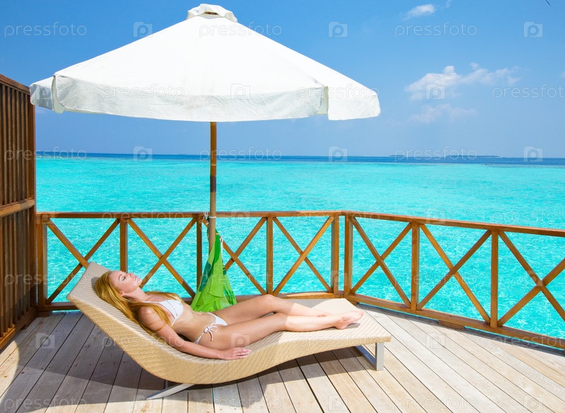 Молодая женщина загорает у океана, Мальдивы