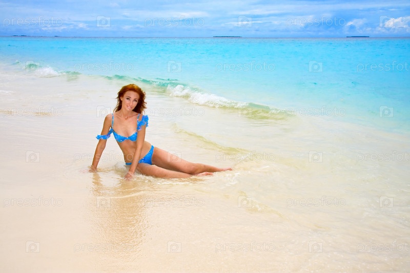 Молодая женщина на берегу океана, Мальдивы