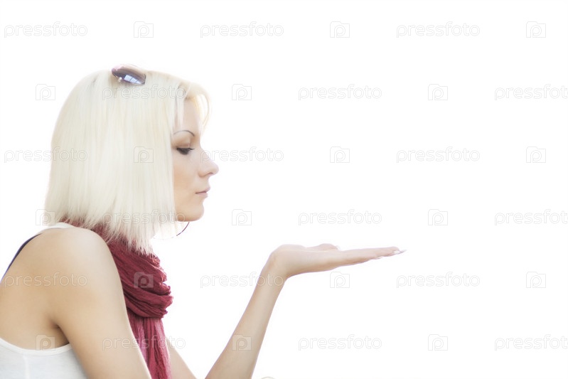 Красивая блондинка с вытянутой ладонью на белом фоне