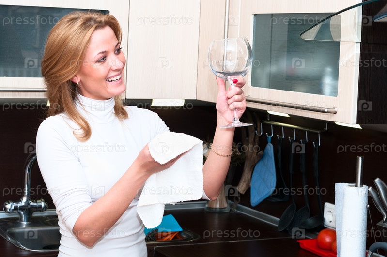 Молодая женщина протирает стеклянный бокал