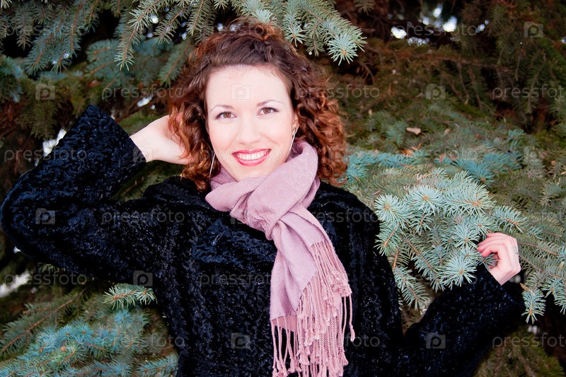 Молодая красивая девушка позирует в парке на фоне декоративной ели