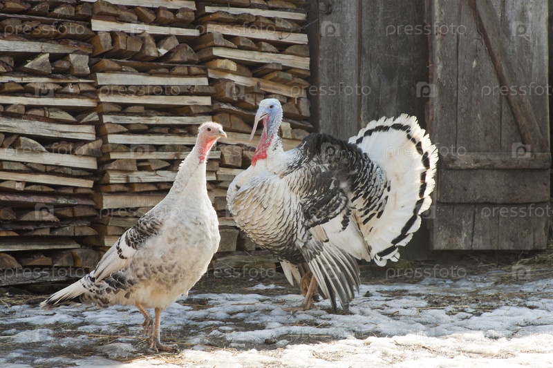 Индюк с индюшкой стоят на фоне сарая и поленницы дров