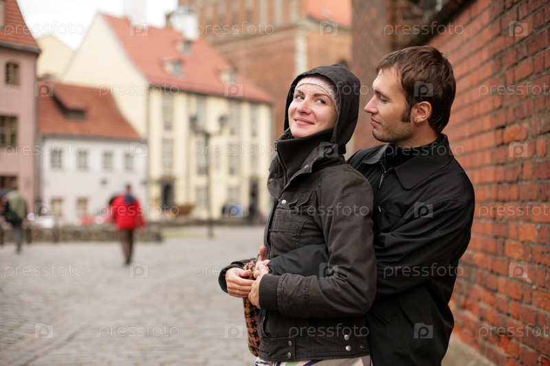 Молодая пара обнимается на старинной городской площади