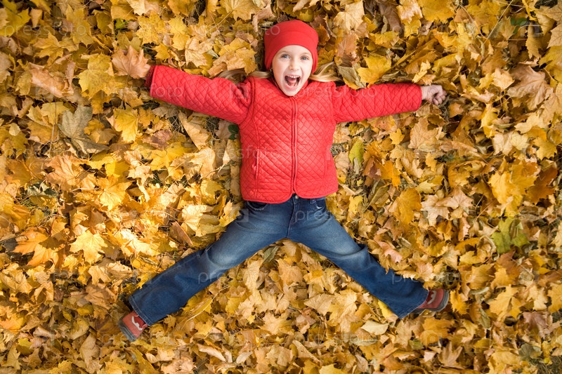 Вид сверху на взволнованного ребенка, кричащего от радости, лежа на сухих осенних листьях