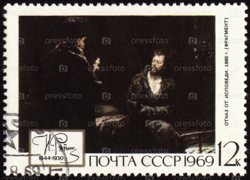 Почтовая марка СССР 1969 года, фрагмент картины "Отказ от исповеди" Ильи Репина