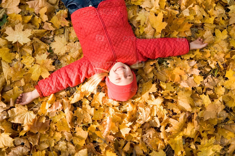 Сверху вид на мирное дитя, наслаждающееся жизнью лежа на осенней земле