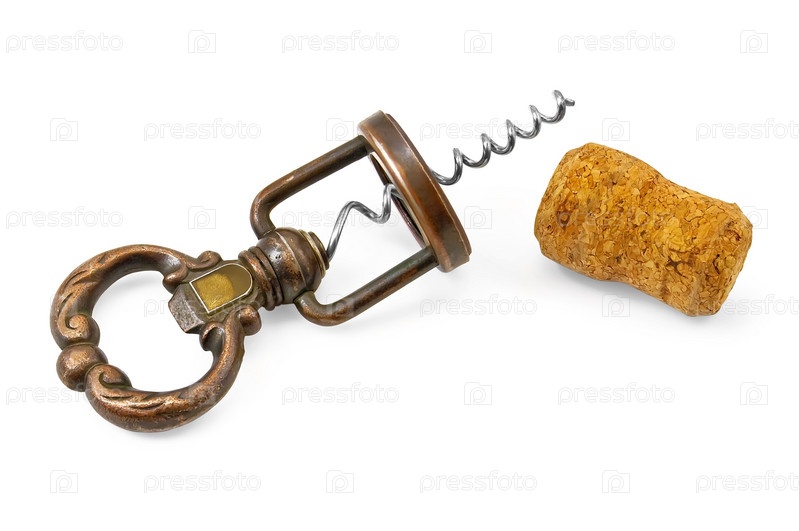 Металлический штопор и пробка от бутылки на белом фоне