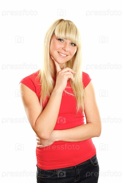 Блондинка в красной футболке на белом фоне