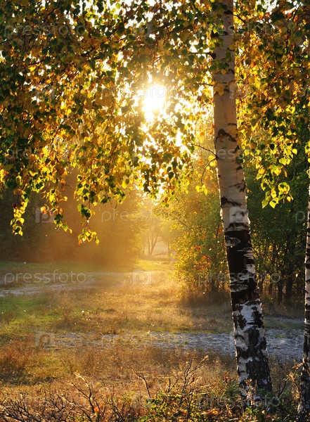 Солнечный свет в осеннем лесу Берёзная роща в осенних цветах