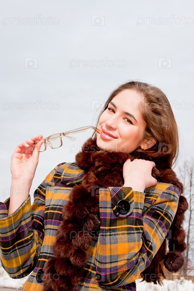 Улыбающаяся девушка с очками на белом фоне
