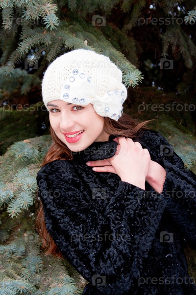 Красивая девушка в вязаной шапке на фоне хвойных деревьев
