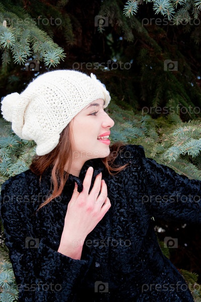 Красивая девушка в вязаной шапке на фоне хвойных деревьев