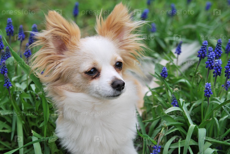 Длинношерстная чихуахуа на фоне цветов