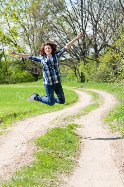 Счастливая женщина в прыжке на дороге