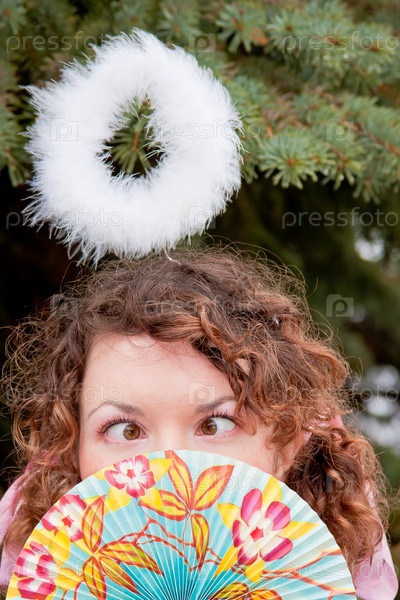 Девушка с нимбом прячется за веером, скосив глаза