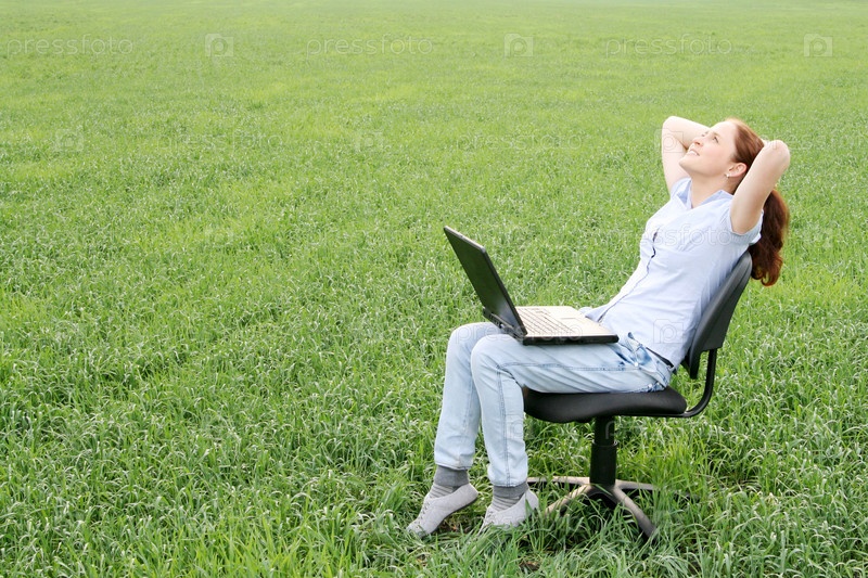 Девушка, сидящая с ноутбуком в офисном кресле на природе