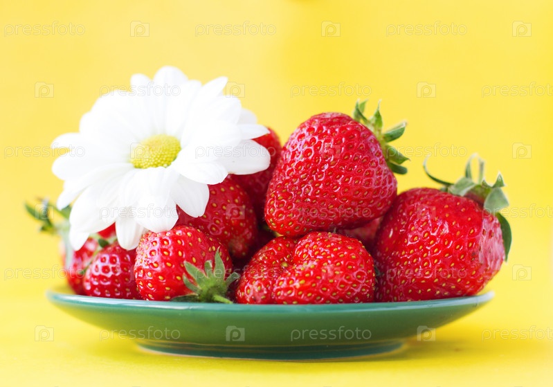 Спелая клубника и цветок на тарелке на желтом фоне