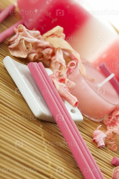 Ароматические свечи и палочки, подставка и лепестки на бамбуковой поверхности