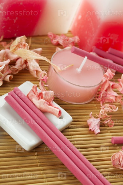 Ароматические свечи и палочки, подставка и лепестки на бамбуковой поверхности