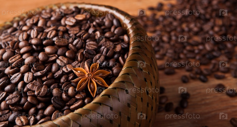 Жареный кофе в зернах в бамбуковой корзинке