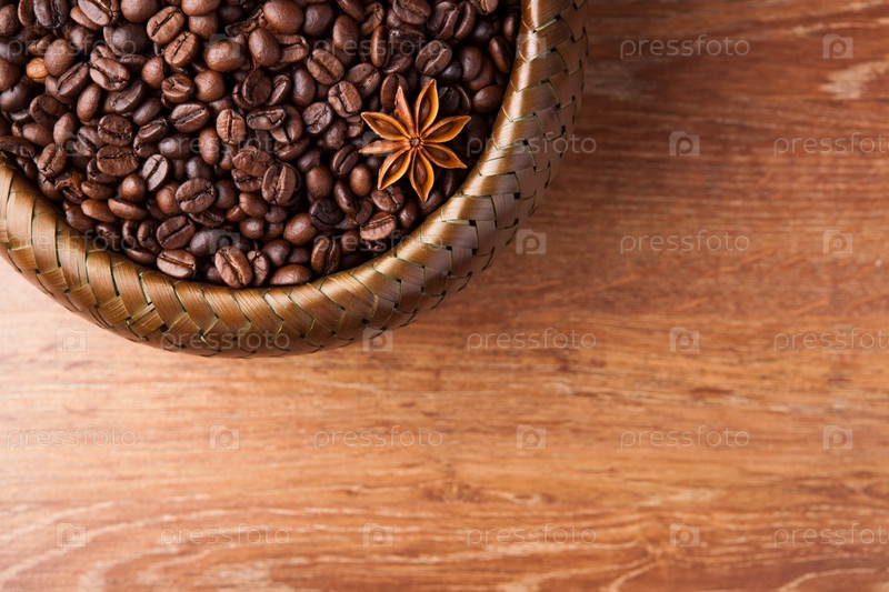 Жареный кофе в зернах в бамбуковой корзинке
