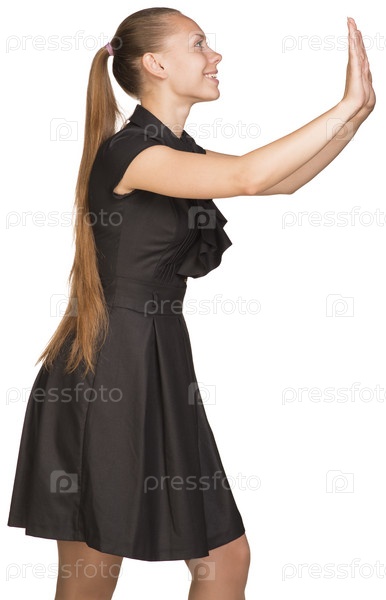 Молодая женщина толкает воображаемый объект