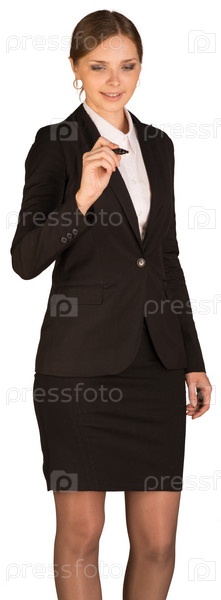 Красивая девушка в деловом костюме что-то пишет в пространстве