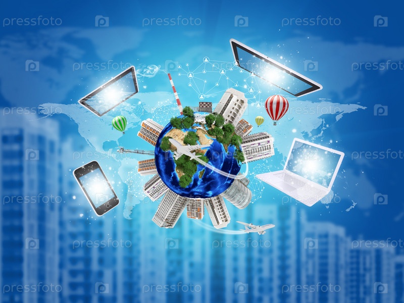 Ноутбук, планшетный компьютер и телефон летают вокруг Земли