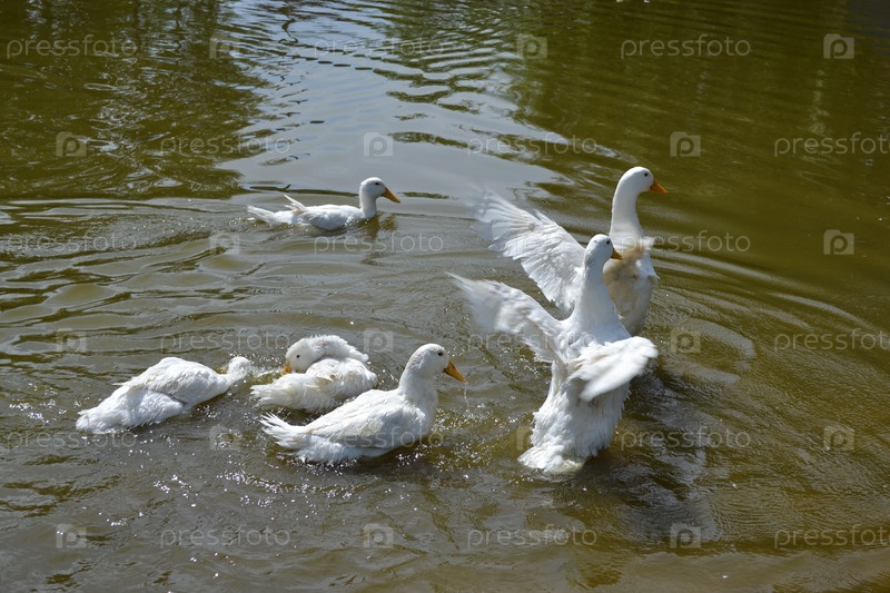 Стайка уток плавает в водоеме