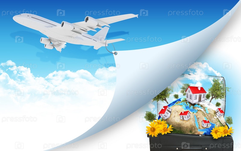 Самолет и земля с постройками в дорожной сумке