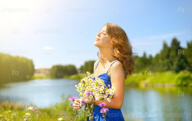 Красивая девушка с букетом ромашек