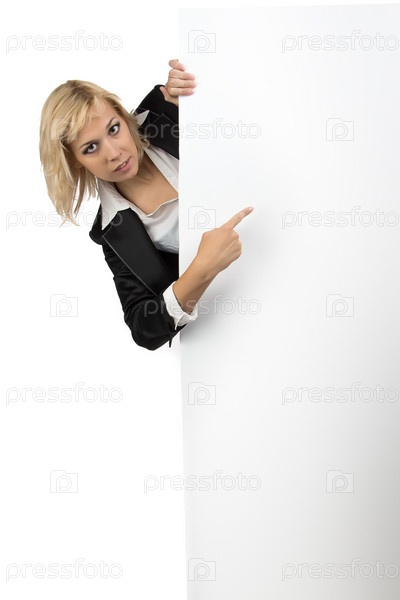 Бизнес-леди выглядывает из-за белого щита