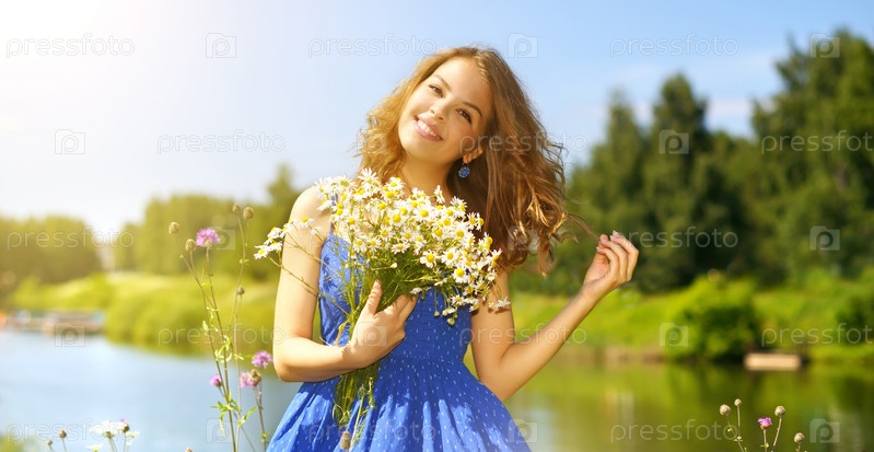 Красивая девушка с букетом ромашек