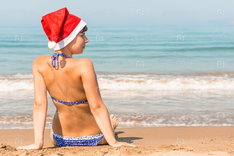 Красивая молодая женщина празднует новый год на пляже