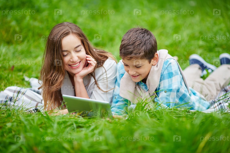 Мать с сыном на траве с планшетом