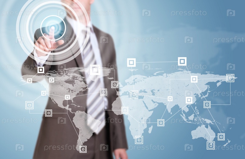 Бизнесмен нажимает виртуальную кнопку