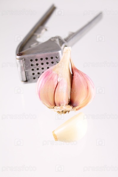 Чеснок с кухонным прессом на фоне, удаленном вблизи