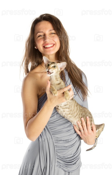Красивая девушка с кошкой, изолированная на белом фоне