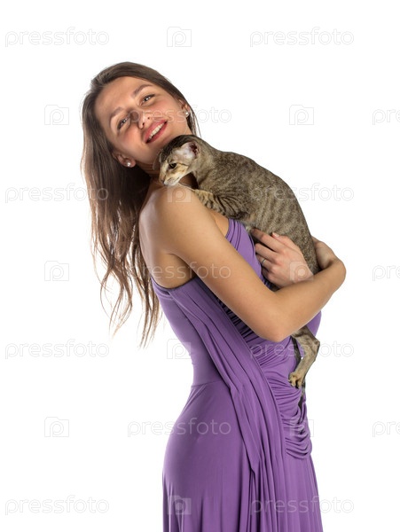 Красивая девушка с кошкой, изолированная на белом фоне