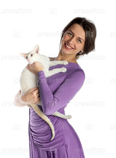Красивая девушка с кошкой, изолированная на белом фоне