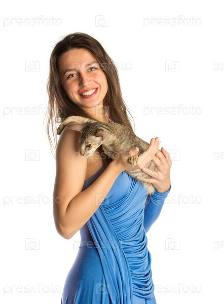 Красивая девушка с кошкой, изолированная на белом фоне