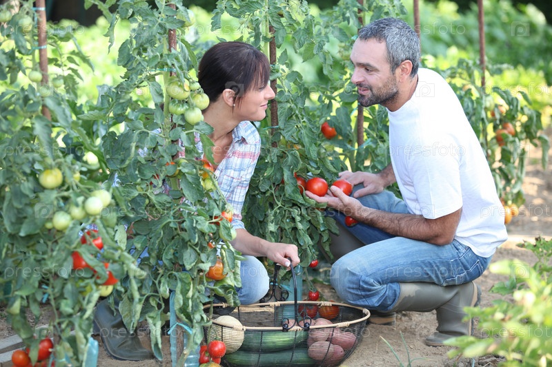 Пара собирает урожай в саду