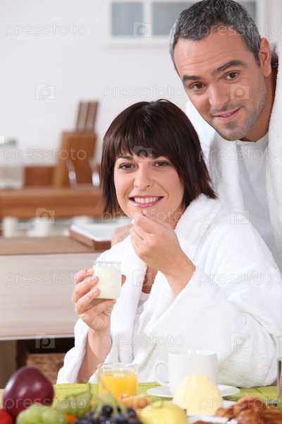 Муж и жена завтракают дома